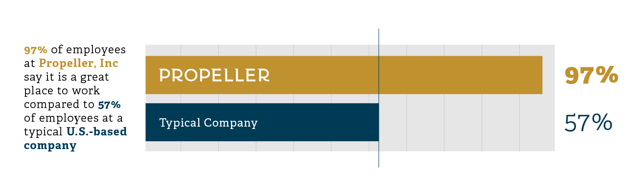 Almost a quarter of a million employees from Great Place to Work-Certified™ companies with 100 to 999 U.S. employees were surveyed to determine the Best Medium Workplaces list. Based on the survey results from our people, 97% said Propeller is a great place to work, as compared to 57% of employees at a typical U.S.-based company.