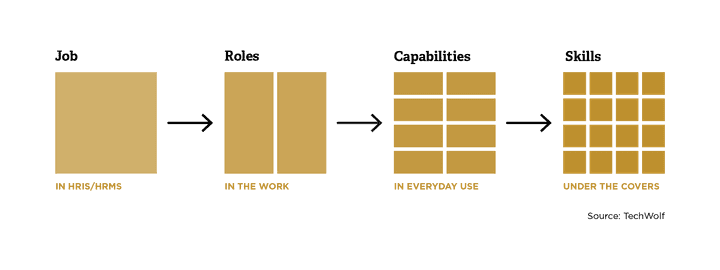 This graphic from TechWolf illustrates how skills relate to and are the building blocks of capabilities and roles.
